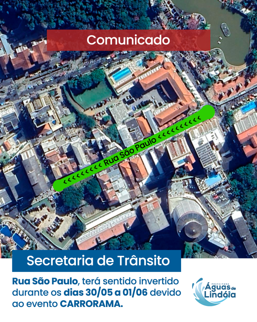 Nos dias 30/05 a 01/06, a Rua São Paulo terá seu sentido invertido para melhor organizar o fluxo de veículos durante o evento CARRORAMA em Águas de Lindóia.